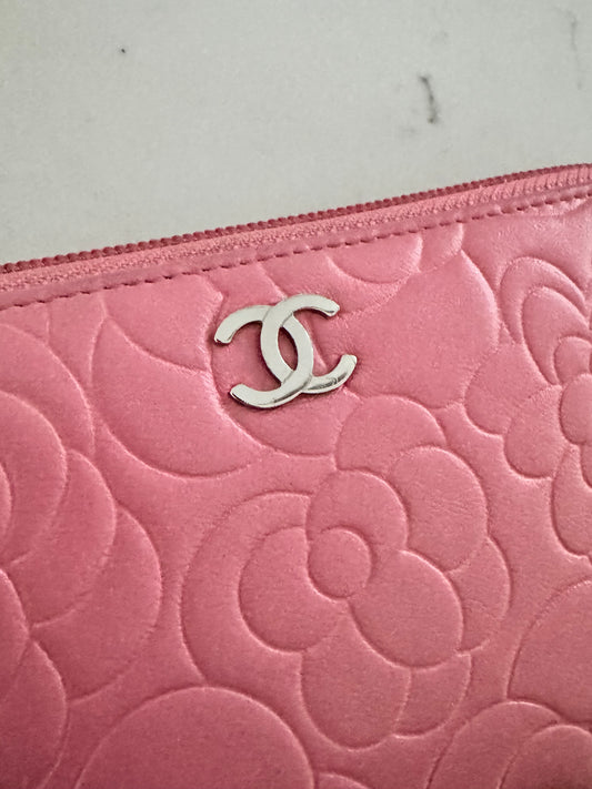 CHANEL Pink Lambskin Zip Around Camelia Wallet