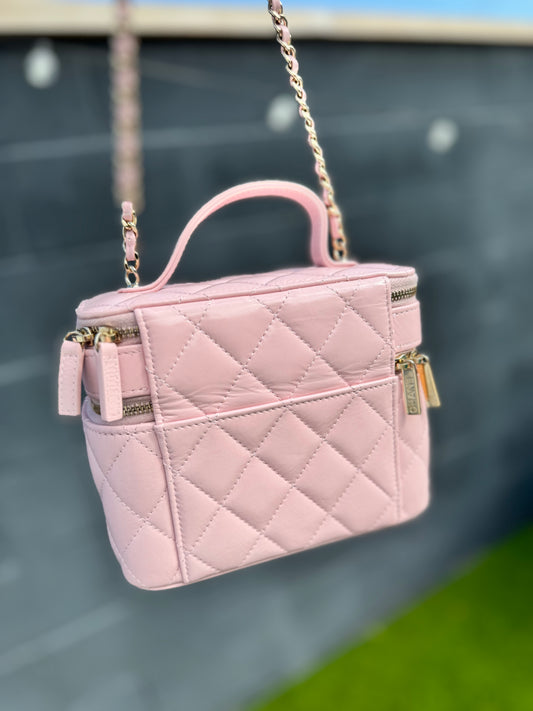 CHANEL Crinkled Pink Lambskin Double Zip Vanity Bag
